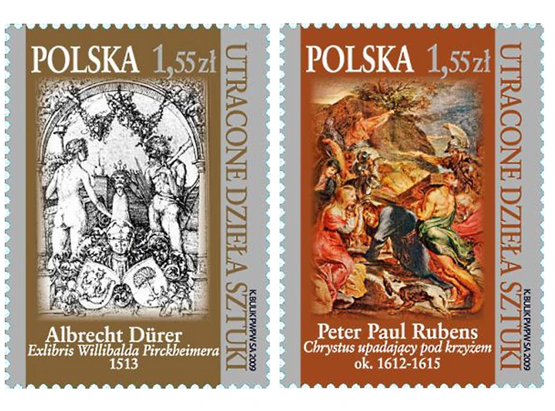 W nowej serii znaczków "Utracone dzieła sztuki" pojawi się rysunek Albrechta Duerera "Exlibris Willibalda Pirckheimera" z 1513 r., obraz Petera Paula Rubensa "Chrystus upadający pod krzyżem" (ok. 1612-1615 r.) oraz akwaforta Rembrandta van Rijna "Józef opowiadający sen" z 1638 r. Dzieła te pochodzą z polskich zbiorów, które zaginęły podczas II wojny światowej.