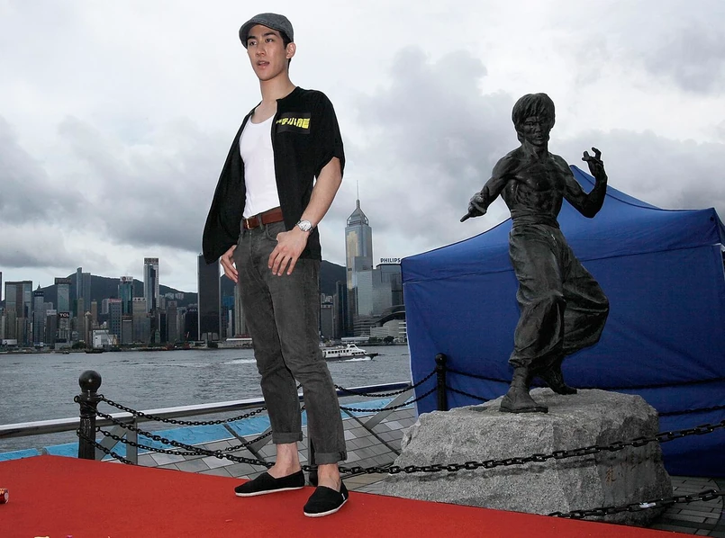 Aarif Lee pokłonił się na nabrzeżu przed pomnikiem Małego Smoka w Hongkongu, gdzie w poniedziałek zorganizowano konferencję prasową. Powiedział, że przygotowuje się do roli, oglądając filmy z Bruce'em i ćwicząc styl wing chun, którego Bruce uczył się jako nastolatek w Hongkongu.