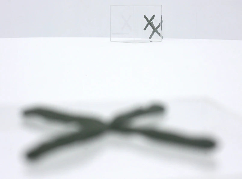 Wystawa w łódzkim Atlasie Sztuki jest kontrastowa. Ekspozycję pokazano w dwóch salach - białej i czarnej, ciemnej i jasnej. Ta jasna jest galeryjnym white cube’em, ulubionym przez konceptualistów białym pudelkiem na spekulatywną, intelektualną, pojęciową sztukę. Oglądamy tu "Stół z X-ami", elegancką, współczesną rekonstrukcję pracy z połowy lat 70, kiedy Kwiek i Kulik tworzyli duet w życiu i sztuce, nazywając się KwieKulik. Na wielkim okrągłym stole leżą tuby z przezroczystej pleksi oraz "iksy" zrobione z plasteliny. Z opisu dowiadujemy się, że "KwieKulik stworzyli abstrakcyjne modele wszystkich możliwych relacji między niewiadomą X (symbolizowaną przez plastelinę w kształcie "X") a jej przestrzennym usytuowaniem (sytuacje symbolizowane przez przezroczyste bryły i płaszczyzny). Relacje te w języku werbalnym wyrażane są za pomocą przyimków przestrzennych: na, nad, pod, poza, przed, za, obok, w, pomiędzy, wśród". Mając do dyspozycji modele, możemy przystąpić do działania - używać pracy, czyli uruchomić imaginację, bo "Zadaniem widza jest podstawić sobie w wyobraźni pod modele z niewiadomą X: 1.Coś, co może się zdarzyć (np. kotlet na talerzu, śmieć w kuble, lampa pod sufitem). 2. Coś, co może, ale zwykle nie zdarza się (np. niemowlę w muszli klozetowej, but na głowie) 3. Coś, co nie może zdarzyć się w rzeczywistości, ale można sobie wyobrazić (np. słoń w szklance)."