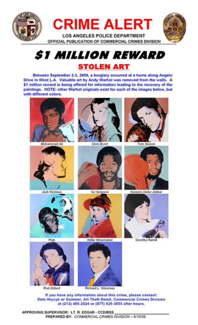 Co łączy tenisistę Chrisa Everta, Muhhamada Alego i łyżwiarkę Dorothy Hamill? Wszystkich sportretował Andy Warhol w charakterystycznym dla siebie pop-artowym stylu. Warta kilka milionów dolarów kolekcję 10 obrazów słynnych sportowców skradziono z domu multimilionera Richarda Weismana.
