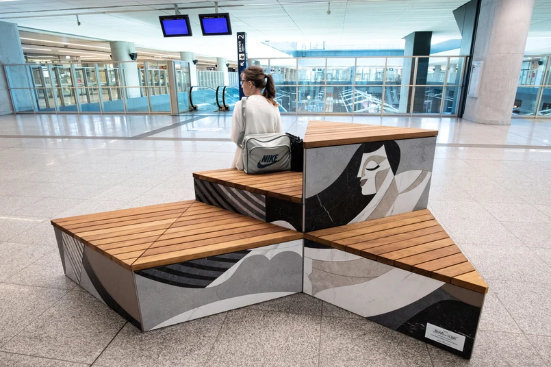 "Ławka jest inspirowana motywem przewodnim dworca, czyli trójkątami, które pojawiają się zarówno na szklanym dachu, jak i przewijają się w identyfikacji oraz meblach dworcowych. Konstrukcja nadaje się na zewnątrz i wewnątrz. Intencją projektantki było pokazanie, że płytki ceramiczne są bardzo wdzięcznym tworzywem, które można wykorzystać także do projektowania mebli miejskich" – wyjaśniła Olga Łosiak ze Studia Izabela Bołoz odpowiedzialnego za projekt.
