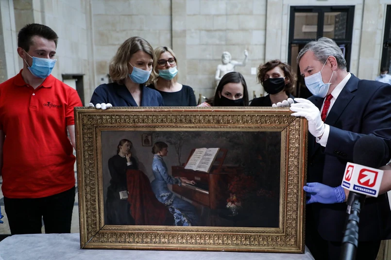 Obraz Jacka Malczewskiego "Przy Fortepianie" namalowany został w 1877 r. Do 1933 r. posiadała go siostra artysty Helena Karczewska. W 1936 r. Rafał Malczewski, syn artysty zaoferował zakup kolekcji prac ojca Muzeum Narodowemu w Warszawie. "Zgodnie z informacjami na karcie inwentarzowej obrazu, która do dziś zachowała się w Muzeum Narodowym w Warszawie, wiadomo, że został on nabyty właśnie od Rafała Malczewskiego i przyjęty do zbiorów Muzeum Narodowego w Warszawie 5 lipca 1937 r." - podał resort.