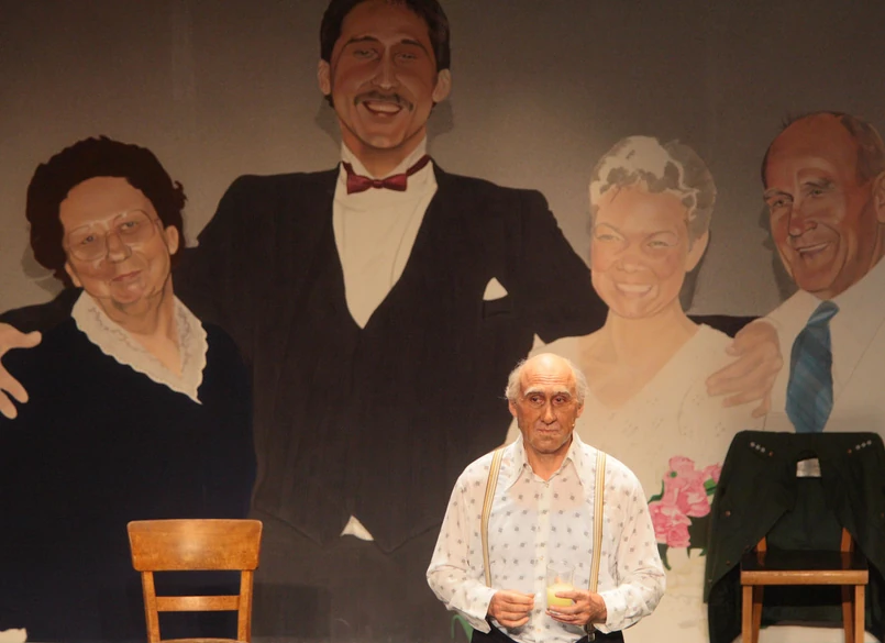 Powstaje wrażenie przeglądania rodzinnego albumu, słuchania skojarzeń i anegdot przywołanych przez zdjęcia. Z przodu sceny, prawie u stóp widzów, leżą szeregiem w gotowości sterty rzeczy. Ubrania, zabawki, sprzęty domowe. Rekwizyty i kostiumy potrzebne do odegrania scenek z przeszłości, pamiątki i ojcowskie atrybuty. Jakby to był rodzaj sezonowej wyprzedaży wspomnień i wiedzy o własnym ojcu.