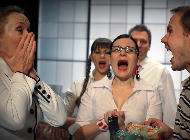 W olsztyńskim spektaklu w nurt pokręconej, barokowo rozdętej narracji Sieniewicza zostaje wrzucony aktor Grzegorz Gromek jako Filip Piszczajko. Piszczyk naszych czasów. Pocieszek. Paszczak. Pisklak. Boli go brzuch, jest noc, służba zdrowia nie działa, szwankuje nawet usługa "dziwka na telefon", a kolejki w osiedlowym sklepie wydają się nie mieć końca. Jakby tego wszystkiego nie było dość, bohatera prześladuje chór trzech Ważnych Pań (trio Fertacz, Grzybowska, Gauer), zbiorowy narrator spektaklu. Nie tylko pakują Piszczajkę w kolejne kłopoty, rzucają go to tu, to tam taksówką po śpiącym mieście, ale i testują jego cielesną giętkość, zwrotność i sceniczną plastyczność. Przypomina to tortury lalkarza na marionetce albo sex-gruppen. I wychodzi na to, że generalnie obywatel Piszczajko zmaga się nie tylko z własną trzydziestoletnią przeciętnością i nieudacznictwem, co z metaforą życia jako supermarketu. Co będzie, jak cię kiedyś nie podliczą przy kasie, jak kolejka nie posunie się ani o milimetr, jak czytnik nie wykryje kodu kreskowego, jak nie będzie miał czym zapłacić za nabrany do wózka towar… Albo wygrasz w ofercie zdrapce tytuł sklepowej "Żydówki", czyli "pani, której nie obsługujemy". Jędrzejas idzie dalej i sugeruje, że jesteśmy w teatrze, który działa jak supermarket: kupuj i konsumuj, przestrzegając reguł obowiązujących na hali. To dlatego co jakiś czas zapala się światło na widowni i słychać ogłoszenia pana z hiperobsługi. Na scenie nieodpakowane z folii kanapy, plastikowe kontenery i skrzynki. To nie jest prawdziwy świat - to sklepowe zaplecze, magazyn, oferta handlowa. Nie przypadkiem wszystkie postaci poza Piszczajką wygladają jak pracownicy tej samej firmy.