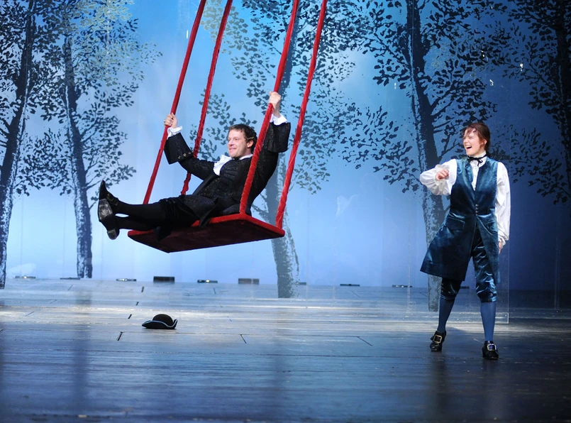 Przedstawienie Lassalle’a jest przyjemnością chodzenia labiryntem kultury. Nowoczesne technologie oświetlenia, dekoratorskie materiały nieznane w czasach Marivaux użyte zostały przez Dorotę Kołodyńską do zbudowania scenografii imponującej myśleniem o tradycji teatru i łączeniem jej z myślą współczesną. Na scenie wciąż obecna jest Natura. Towarzyszy akcji, buduje nastrój, jest aktywnym aktorem przedstawienia. Jest jednak skonwencjonalizowana, zgodnie z estetycznym ideałem Baroku i Rokoko dążących do włączenia przyrody w wielkie teatrum tej epoki. Ogromną scenę Teatru Narodowego zamykają z boku drzewa. Są obrazami pokrywającymi ogromne plastikowe płachty. Zawieszone jedne za drugimi coś przypominają ludziom znającym historię teatru. To przecież dawne teatralne kulisy. Ruchome reflektory o zmiennych kolorach światła wyczarowują w scenicznym prospekcie pierzaste chmury, wędrujący księżyc przeświecający zza gęstwiny drzew. Hrabina siada na ogrodowej huśtawce tak dobrze znanej ze słynnego obrazu Fragonarda, reprodukowanego zresztą w programie przedstawienia. Zwraca uwagę ruch sceniczny, wypracowany, baletowy niemal gest dłoni Małgorzaty Kożuchowskiej powstrzymującej zbytnią śmiałość Lelia (Grzegorz Małecki), baletowa płynność i elegancja kroku. To jest dzisiejszy barokowy teatr, a właściwie jego poetyka z całą konwencjonalnością – przystosowana wszakże do wrażliwości człowieka XXI wieku.